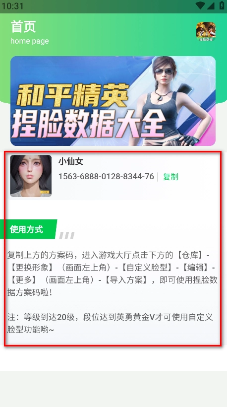 进入游戏大厅点击下方的【仓库】-【更换形象】(画面左上角)-【自定义脸型】-【编辑】-【更多】(画面左上角)-【导入方案】(注:需等级20级且段位达英勇黄金V才可使用该功能)