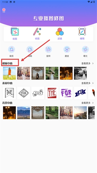 1、进入“专业抠图修图”工具的首页后,找到并点击【模板中心】板块,从中挑选出符合需求的模板风格。