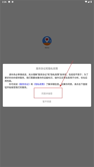 1、在“相亲站”的协议,点击【同意并接受】按钮,确认《服务协议》和《隐私政策》,进入应用的相亲功能流程。