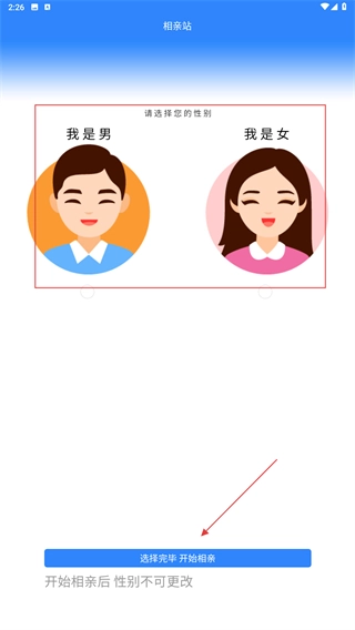 2、在性别选择页,选择【我是男】或【我是女】的性别选项后,点击【选择完毕开始相亲】按钮,进入相亲环节(性别选定后不可更改)。