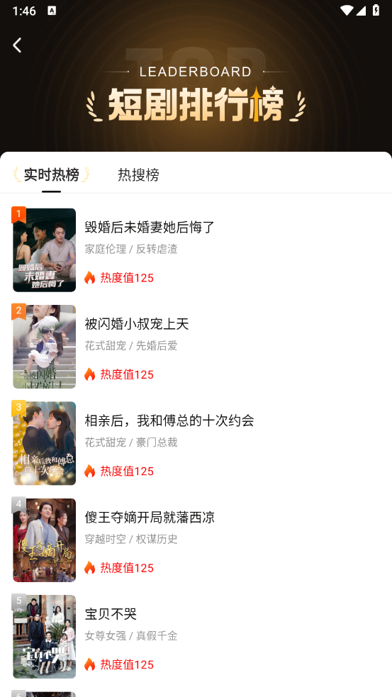 3、点击右上方的“短剧榜单”进入,就能随时查看实时热榜与热搜榜单的信息。