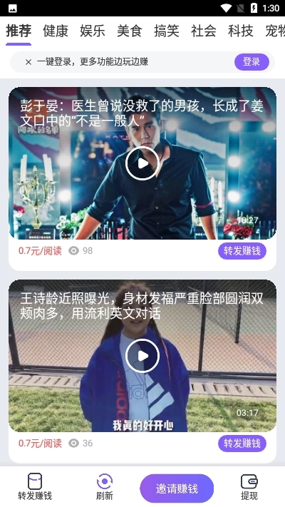 转发文章就能赚钱,新用户登录就送0.92元,还支持自己上传文章;