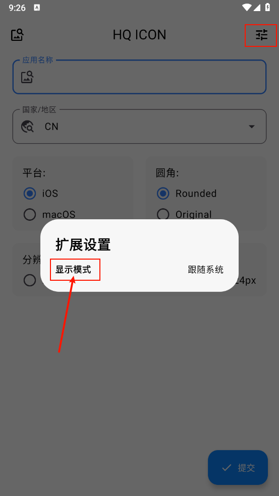 4、随后点击右上角的图标进入扩展设置界面,再点击“显示模式”选项。
