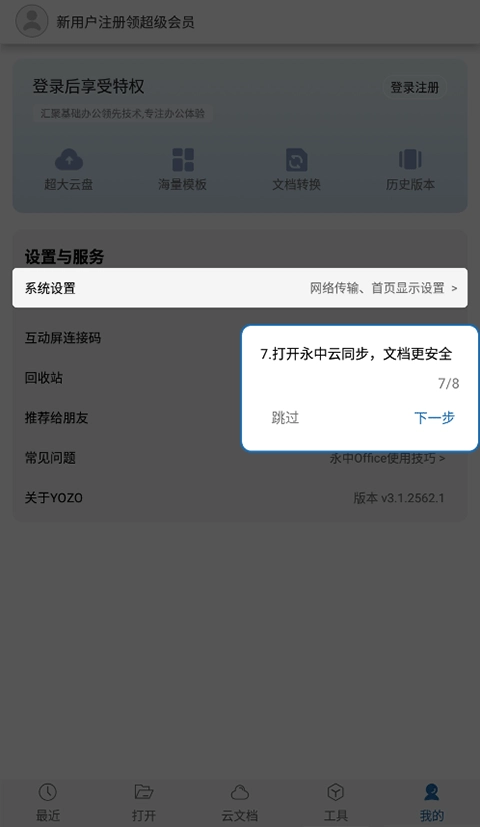 6、打开永中云同步,文档更安全。