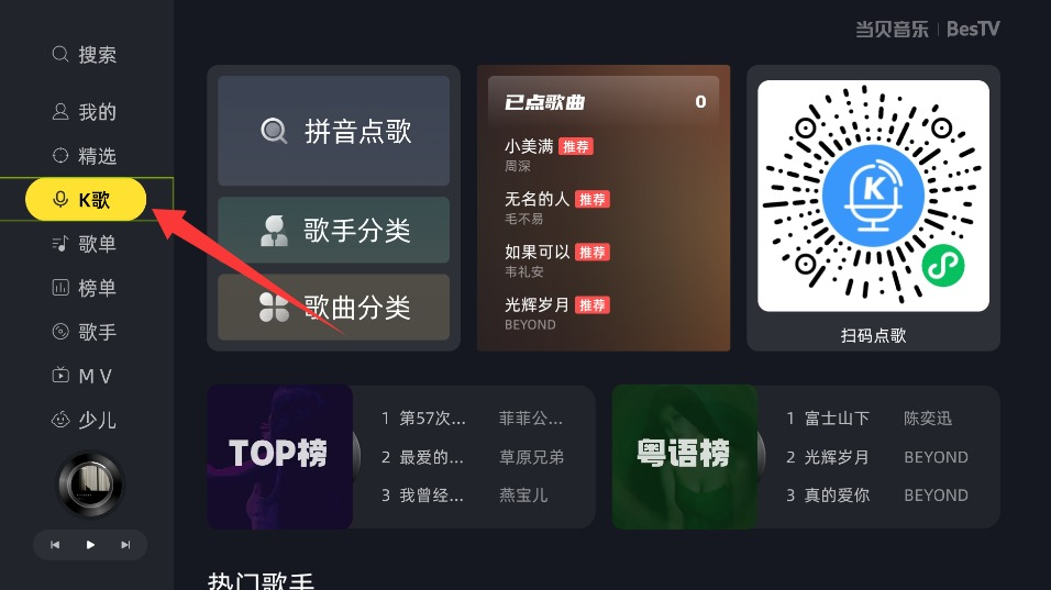 1. 若要打开当贝音乐的K歌模式,需点击左侧功能栏,进入专属歌唱界面后便可准备点歌。