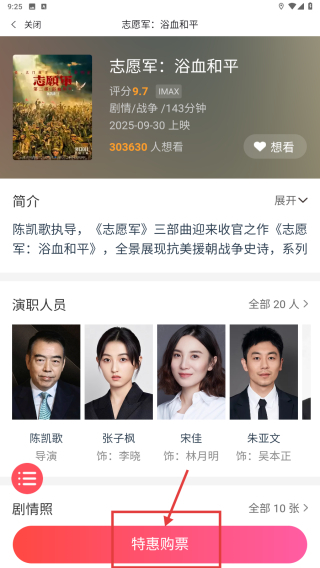 4、于电影详情页面,点击特惠购票按钮,以完成该电影的购票流程。