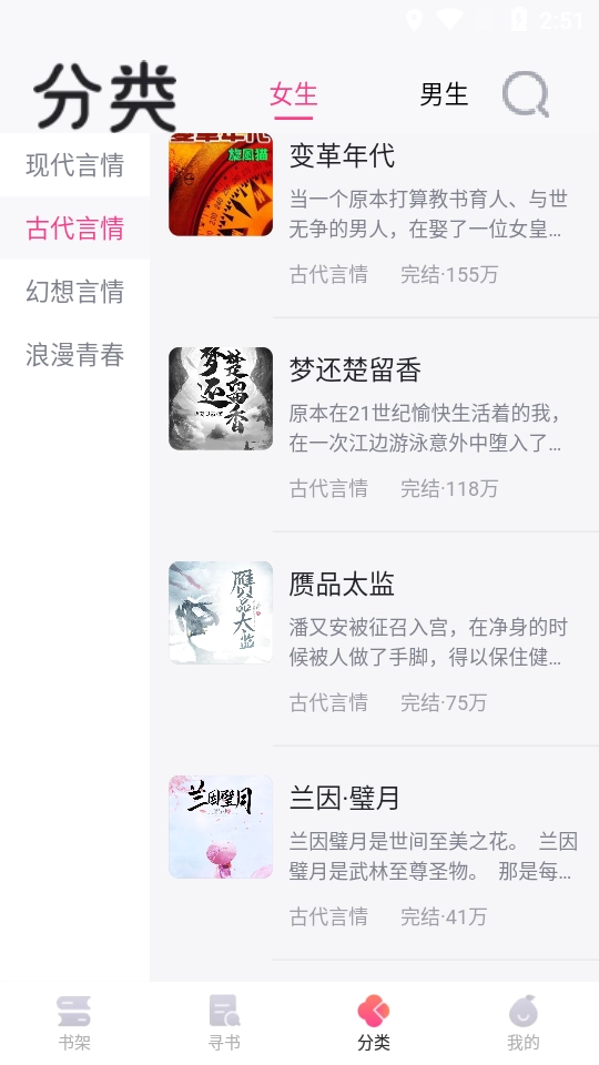 【品类丰富】覆盖言情、穿越、玄幻、校园、古典武侠等多种类型。