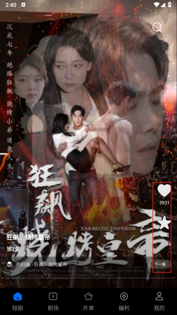 2、启动软件后,进入短剧专区,通过上下滑动操作就能切换不同的短剧资源,还可以随时点击进行收藏或切换剧集。