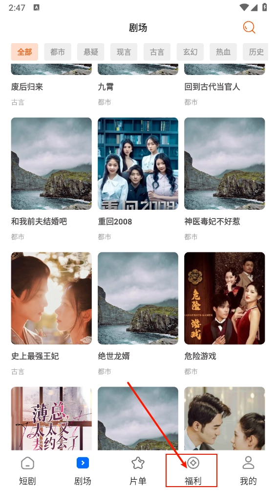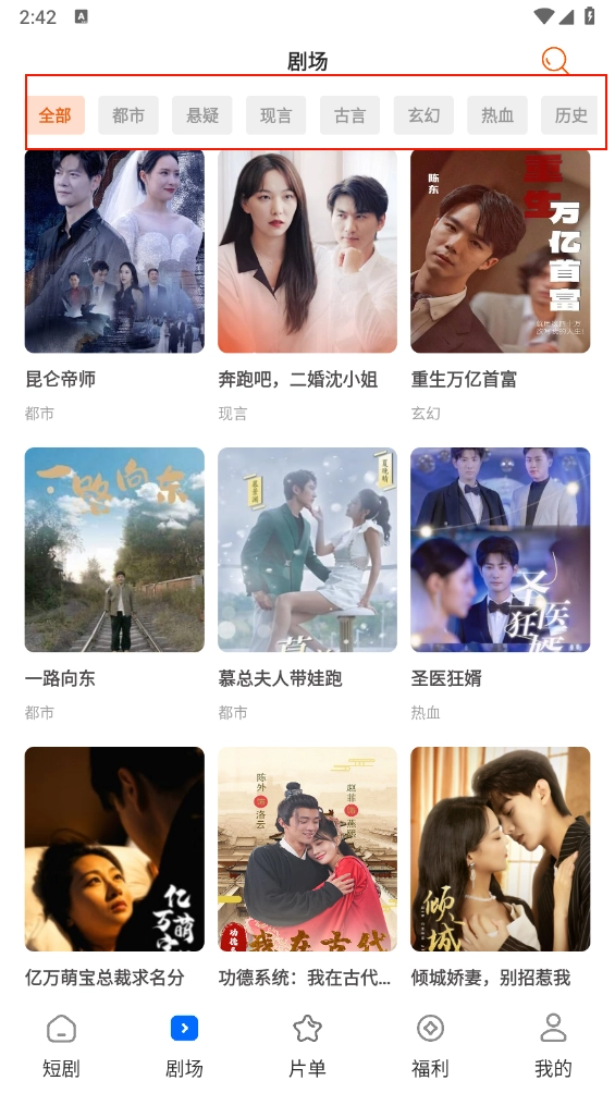 3、进入“剧场”板块,这里涵盖都市、现代、热血、历史等多种类型,大家可以根据个人喜好选择观看。