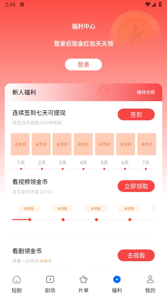6、最后在“福利”板块,新人登录后每天都能领取大量金币。