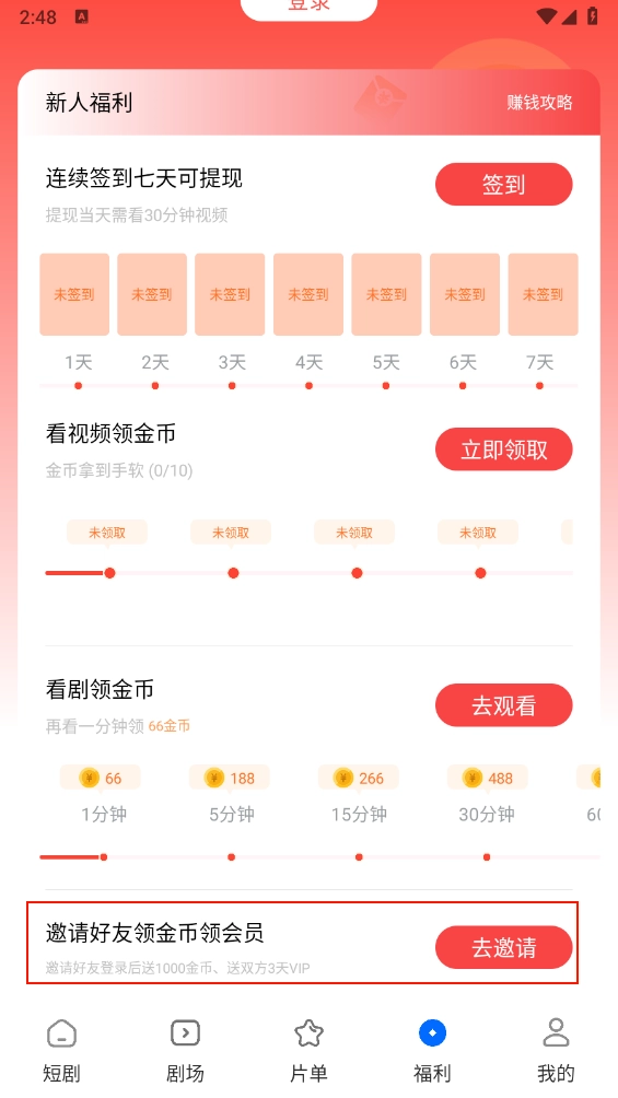 2、进入“福利”页面后,向下滑动找到“邀请好友领金币领会员”的活动入口,点击“去邀请”按钮。