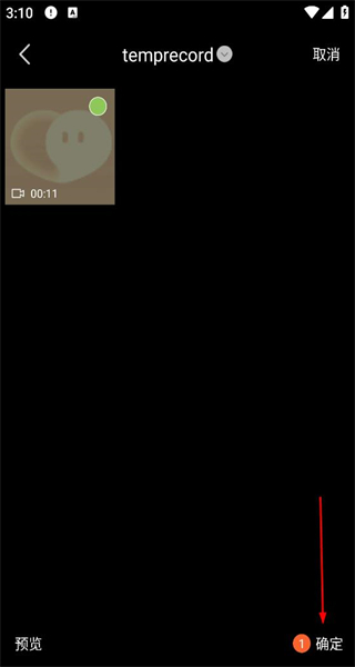 2、在temprecord页面,选中目标视频,点击页面右下角确定按钮,进入视频编辑环节。