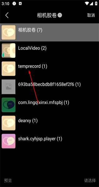 1、打开软件后,进入相机胶卷页面,浏览文件列表,选择temprecord文件夹,进入该文件夹查看内容。