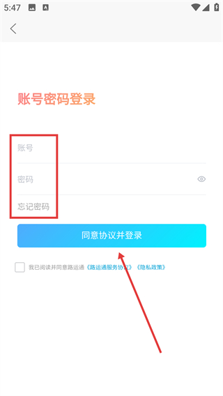 4、在登录页填写【账号】【密码】,勾选协议后点击【同意协议并登录】,完成货主账号的登录操作。