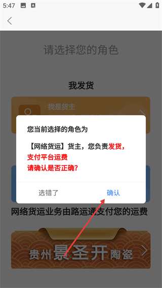 3、在角色确认弹窗中,点击【确认】按钮,确认选择【网络货运】货主角色,进入登录流程。
