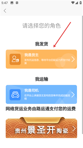 2、在角色选择页,点击【我是货主】选项,选择以货主身份参与网络货运业务。