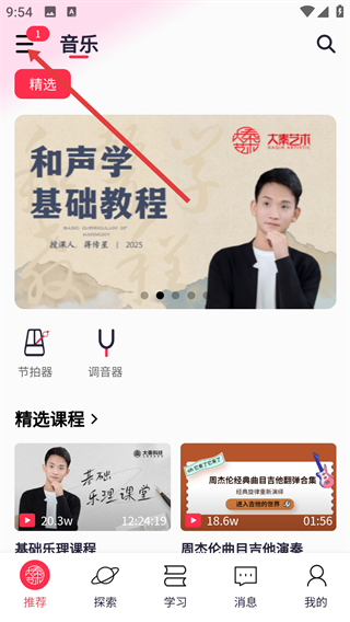 1、在【音乐】页面点击左上角菜单按钮,进入个人相关操作界面,页面含【精选课程】等内容,底部有【推荐】-【探索】等功能tab。