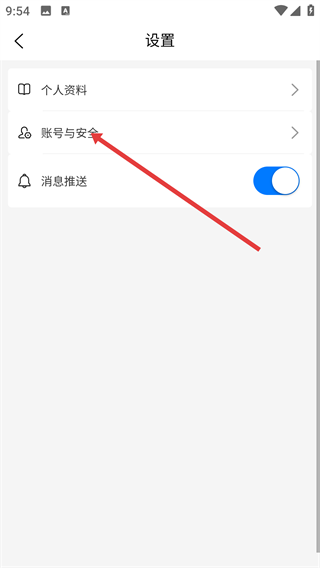 3、在【设置】页面点击【账号与安全】选项,进入对应的账号配置界面,该页面还有【个人资料】-【消息推送】等功能项。