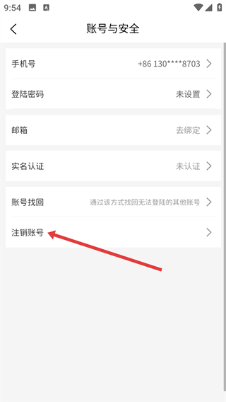 4、在【账号与安全】页面找到【注销账号】选项,可进行账号注销相关操作,页面还显示【手机号】-【登录密码】等账号信息项。
