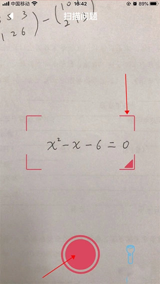 3、开启手机摄像头,把题目放到屏幕提示的区域里,接着点击下方的红色按钮;