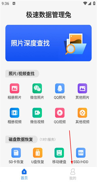 1、打开软件后,进入首页,看到照片深度查找等功能,点击我的选项,进入个人中心页面。