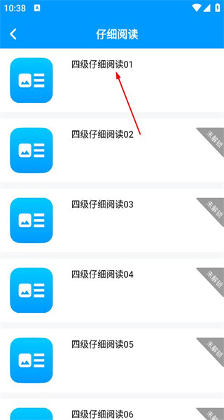 2、进入仔细阅读的列表页面后,能看到若干四级仔细阅读练习题,从中选择“四级仔细阅读01”,即可进入该练习的答题界面。