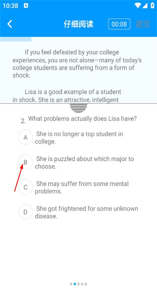 4、接着完成第二题的作答,阅读与之相关的内容后,选择选项B,以此推动练习的答题进程。