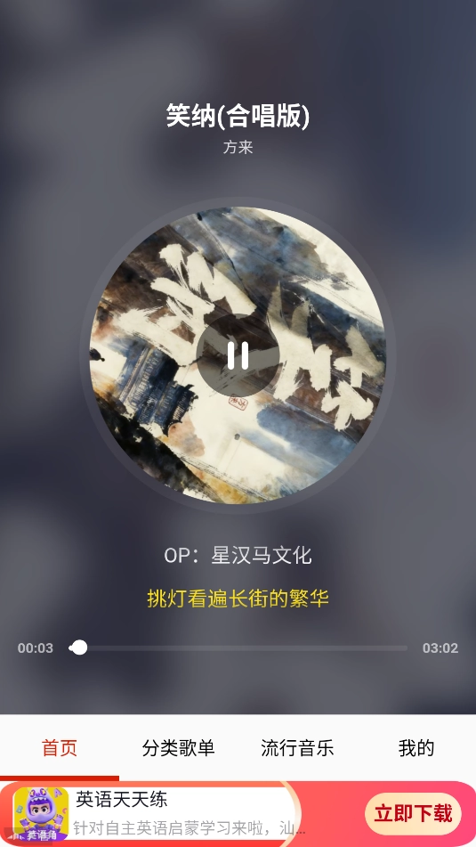3、点击进入播放界面后,软件会以音频歌曲的形式进行播放,同时还会显示对应的字幕内容。
