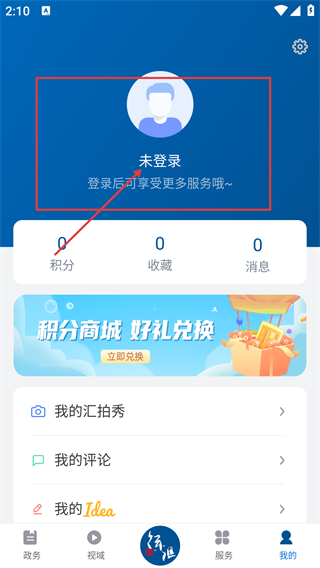 2、进入【我的】页面后,点击【未登录】区域,跳转至登录界面,以便解锁更多功能服务。