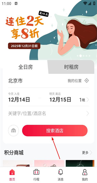 1、启动软件后,进入首页界面,设置好入住与离店的日期,点击搜索酒店的按钮,即可进入酒店列表页面。