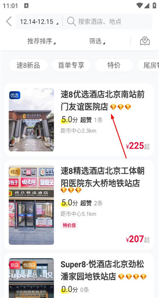 2、进入酒店列表页面后,浏览系统推荐的酒店,从中选择速8优选酒店北京南站前门友谊医院店,点击进入该酒店的详情页面。