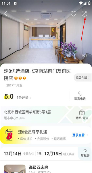 3、进入酒店详情页面后,浏览酒店的相关信息以及各类房型,随后点击分享按钮,此时会弹出分享选项栏。