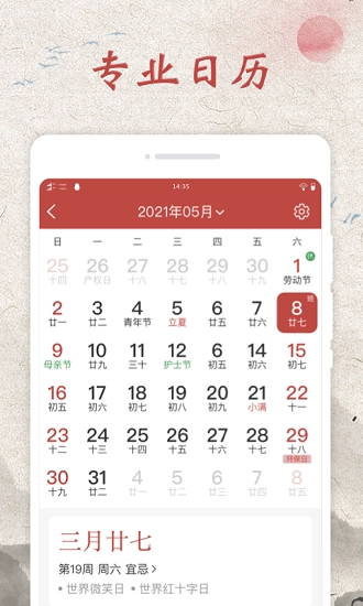 日历功能: 提供详细全面的周历与月历信息,整合了二十四节气、节假日安排,同时支持随时查看国外节日与传统节日。
