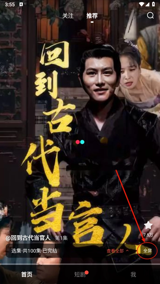 2、打开软件后进入推荐页面,点击全屏就能开始观看,上下滑动屏幕即可切换不同短剧。