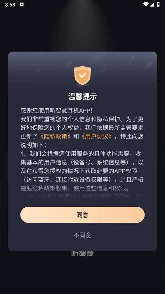 1、首先在本平台安装听智慧耳机,同时查阅相关的用户协议与隐私政策。