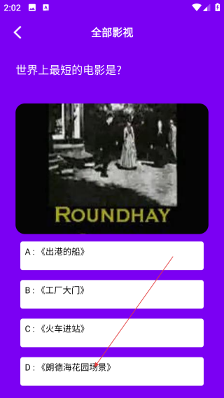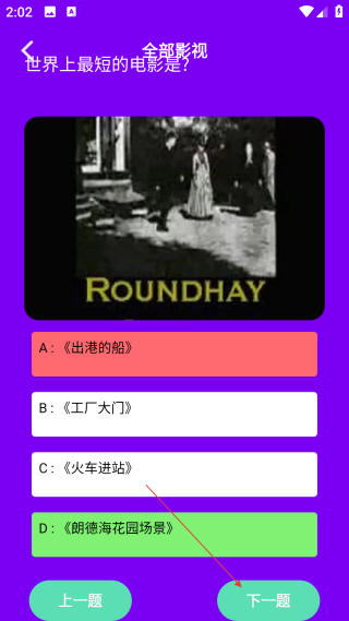 4、在答题界面,点击【下一题】按钮,就能继续参与影视知识答题。