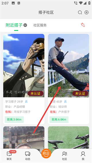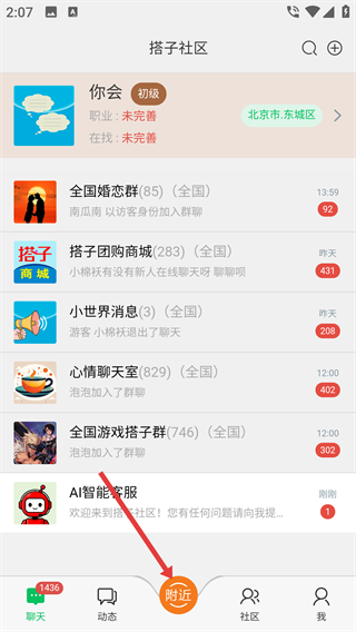 在搭子社区的聊天页面,点击底部导航栏的“附近”按钮,即可进入附近搭子列表页面。
