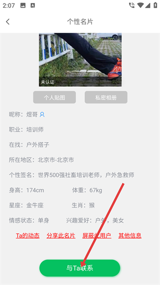 3、在个性名片页面,点击底部的“与Ta联系”按钮,即可进入和该搭子的聊天界面。