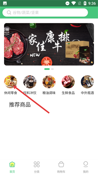 2、进入首页后,点击分类栏里的【休闲零食】选项,查看该分类下的商品列表,并浏览页面呈现的推荐商品内容。