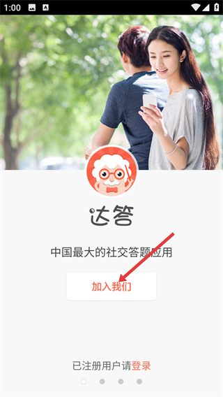 1、打开“达答”应用,在欢迎页面找到【加入我们】按钮并点击,即可进入应用的注册信息填写界面。