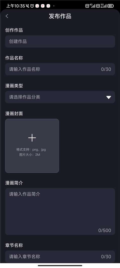 4、下滑上传漫画的封面并输入简介。