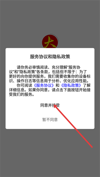 1、仔细阅读【服务协议】与【隐私政策】中的各项条款,在清楚了解信息收集的相关说明后,点击弹窗里的【同意并接受】按钮,就能进入应用开始使用其提供的服务。