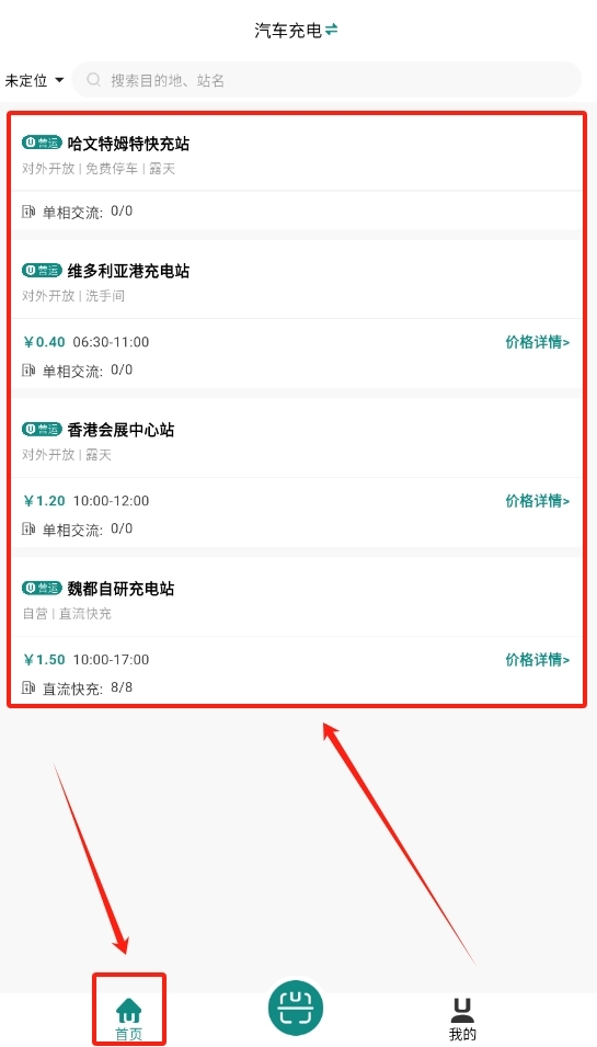 1、启动软件后,在首页挑选一个价格与地址都符合需求的充电站。
