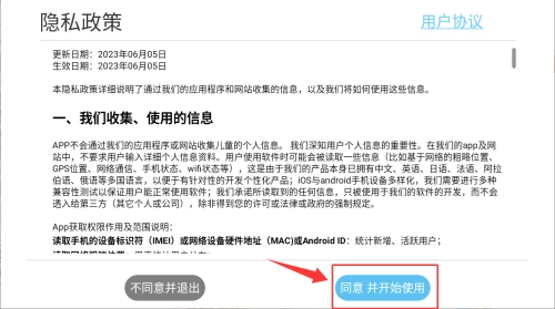 启动应用之后,在隐私政策页面点击“同意并开始使用”按钮。