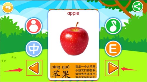 在卡片页面可以浏览苹果等水果的图文信息,还能切换学习内容。