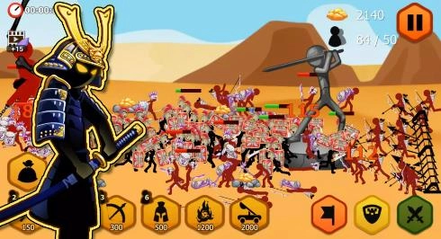 火柴人战争2帝国之战正式版采用火柴人标志性的简约线条设计,角色动作夸张且富有喜剧感,如剑士挥砍时的“面条人”扭曲、弓箭手发射时的后仰动作,既保留了火柴人的幽默基因,又通过动态效果强化了战斗张力。