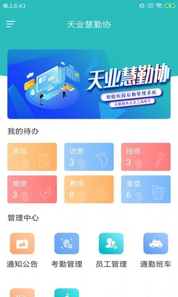 天业慧勤协是一款超实用的校园服务管理软件,功能十分强大,能轻松管理食堂、物资、报修等事项;管理中心还涵盖员工管理、考勤管理与通勤班车管理等模块,操作便捷又省心,感兴趣的话欢迎体验使用!