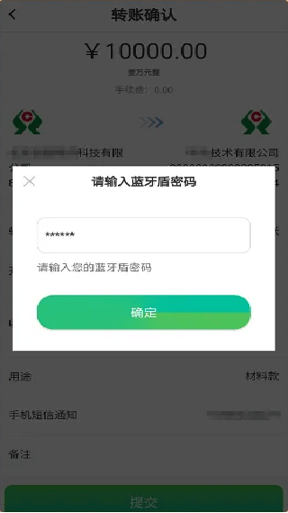 3. 确认核对无误后,点击“提交”。第三步:输入蓝牙盾密码,接着点击“确定”,最后在蓝牙盾上进行确认。