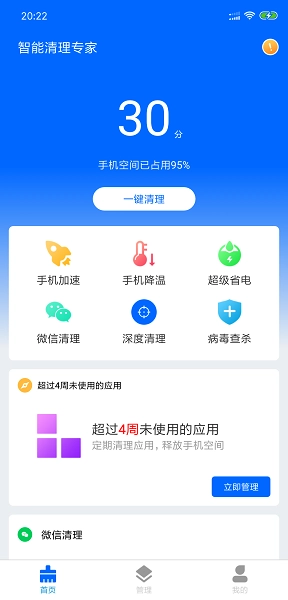 智能清理专家是一款便捷的手机清理工具,提供一键清理、手机加速、降温、省电、深度清理、微信清理、病毒查杀等实用功能,只需一键操作,就能有效解决手机卡顿问题,帮助您释放更多存储空间。