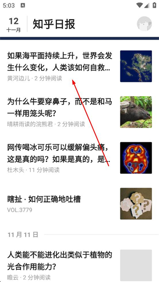 1、打开知乎日报APP,进入知乎日报页面,可看到各类资讯列表,点击感兴趣的资讯。